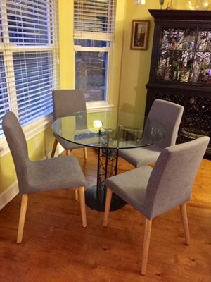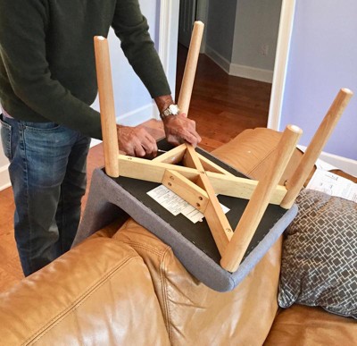 Assembly of the chairs had several steps, but it was not difficult. We were pleased that there were corner blocks and also threaded inserts for the screws*. We didn't have the best results, and were a little uneasy following the "drop it on the floor" technique to level uneven legs. The chairs are just as comfortable as they are good-looking. They're stylish, the wood legs are really wood, and the fabric is nice quality and color tone. The shape of the back and seat along with generous padding throughout make for a comfortable sit. We are crossing our fingers that the legs do not loosen over time thanks to the threaded inserts*, as these chairs will be used at least twice a day, every day.
