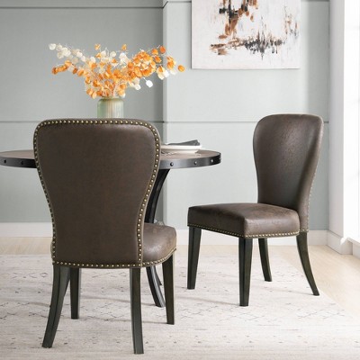 These timeless chairs are sure to bring style and flare to your dining room table. The chairs are upholstered in a premium, distressed faux leather material with nailhead trim which adds to the sophisticated detailing of this classic dining chair. The dark stained legs completes the elegant look of these sturdy yet comfortable, beautiful chairs. Place them in your dining room to enjoy a specia family meal or in your living room to provide extra seating as an accent piece.