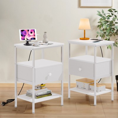 Set of 2 Wood Nightstands with 2 Storage Drawers, LED Light, Charger Station & Ceramic Handle, Farmhouse Night Stand, Grey