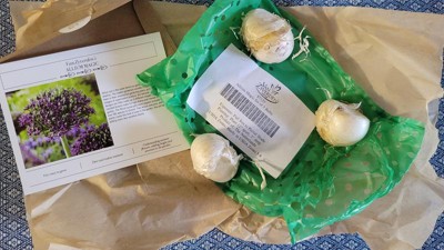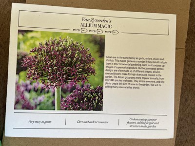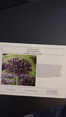 [This review was collected as part of a promotion.] I received the Van Zyverden Allium Magic Set of 3 Bulbs. I have seen these flowers in bloom before, actually right over the summer and they immediately drew me in. I had never seen such a unique and beautiful plant before. The stems are tall and the tops are spherical with tiny little flowers making the shape. So as you can imagine, I was pretty excited to have received these. The packaging is so pretty and even included an envelope with a card that includes a bunch of information. The bulbs themselves reminded me a lot of garlic bulbs. As a matter of a fact, this plant is in the same family. I dug three holes 5 inches deep and 12 inches apart and planted them in a full sun area. I can't wait until they grow! It says it's for zones 5-8 and I'm in NH so I hope they will be ok. I'm not much of a green thumb but they said they're easy to grow and care for.