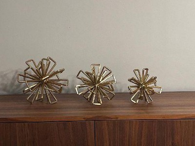 These modern-industrial 3D metal star balls are your DIY home decors. Place them on a tray or bowl to use as tabletop centerpieces alongside books, vases, jars, and wall mirrors. You can also create unique wall art out of them. Or, you can hang them from the ceiling like shooting stars and dream-catchers using thin wires or metal rods. This is a 3-in-1 set. Sizes are 5", 7", and 8", respectively. This luxurious gold set will add some elegance in your glam style interior when displayed on tables or bowls and trays. Wipe clean with a dry cloth. Suitable for indoor use only. 3D geometric décors come as a set of three. Glam inspired. This item comes shipped in one carton.