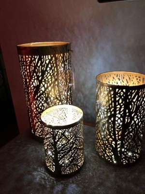 - This metal candle holder set flaunts cylindrical bodies with striking cut-out tree patterns and flat bases