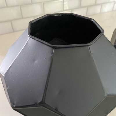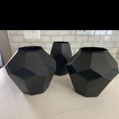 Add bold, black, contemporary style to your shelves or tabletops with this set of 3 metal geometric vases, each with a unique shape. These accent decor pieces make a contemporary dimensional statement against a while wall on their own or fill with your favorite potted plants. Suitable for indoor use only. 3", 3. 4", and 4" vase openings. Set of 3 different styles of geometric black metal vases. This item comes shipped in one carton.