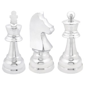 Accessorize your console table or living room dresser with this 3-in-1 set of large, decorative chess piece finials. The chess sculptures include the queen, king, and knight. All carry a chrome-like, metallic silver finish of a solid aluminum. Such a design makes for an unapologetically bold table décor while creating a sophisticated and stylish narrative inside an traditional-themed space. Use as a decorative piece and show your guests your competitive side!. The design makes for an unapologetically bold table décor while creating a sophisticated and stylish narrative inside an eclectic-themed space. Designed with black rubber stoppers at the base that prevent scratching furniture and table tops, as well as sliding around. Wipe clean with a dry cloth. Suitable for indoor use only. Made in India. This set includes three chess pieces. Traditional design. This item comes shipped in one carton.
