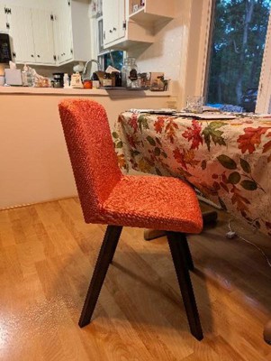 Simple lines define the Mid-Century modern Clybourn Dining Chair (Set of 4) from Buylateral. The sleek design with angled legs reflects a vintage vibe. Each chair is upholstered in a different lively color for a unique look - dark gray, peach red, lime green and yellow. Chairs are padded and comfortably upholstered in a soft linen-like fabric with solid rubberwood legs.
