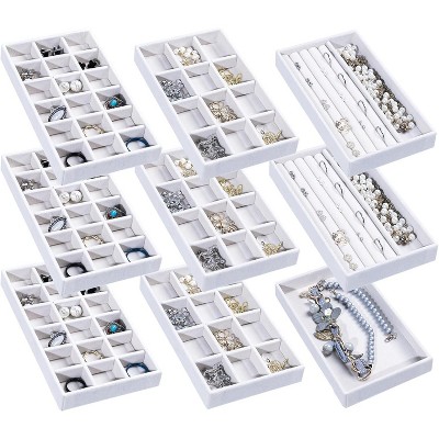 Versatile Tray with Lid: The set of 4 jewelry organizer can be easily split up, combined or stacked to meet your personalized storage needs for men women.Stacks and doesn’t slide, it is a breeze to pack and sit beautifully on your dresser or armoire as a jewelry case, and also can be used as a jewelry drawer inserts. In addition, it is great to display earrings, necklaces, bracelets, rings, brooches, pins, watches in the jewelry store,showcase.