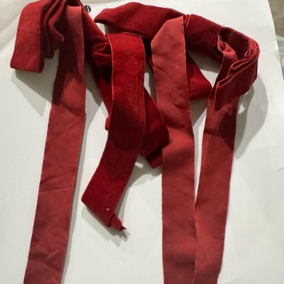 [This review was collected as part of a promotion.] This is a six piece large bow set. Each bow measures about 10 inches in length and 10 inches wide. They each have two satin strings that come out the back that you can use to tie onto other decor or hang. These are a beautiful red color and have a velvet smooth texture to them. They are very hard to shape into a bow shape and have them stay that way. The only way I could get them to stay is if they were laying flat.