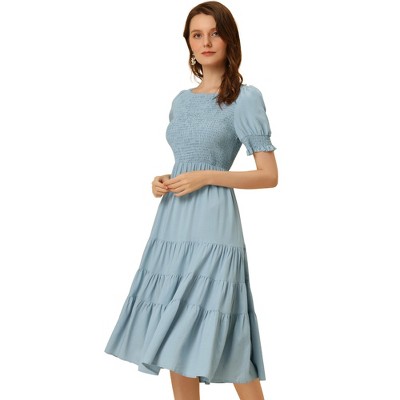 • Feature: Long Sleeve/Smocked Ruffle Cuff/Square Neck/Smocked/Elastic Waist/Pockets/Tiered Ruffle Hem Midi Flowy Dress