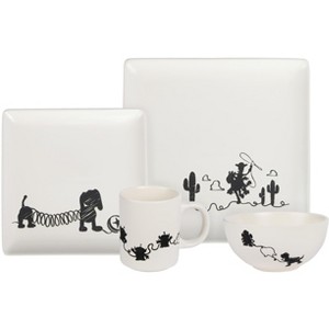 - FUN DESIGN: White dinnerware set features unique black "scribble" artwork depicting the silhouettes of popular Toy Story characters.