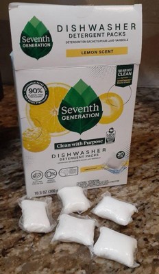 The Seventh Generation Dishwasher Detergent Packs in Lemon scent work really well and leave dishes clean without residue. The packs dissolve fully during the wash and don’t leave any film behind. I haven’t noticed spotting on glasses, and everything comes out looking clear and fresh. They’re easy to dispense and mess-free, which makes loading the dishwasher quick and convenient. I also appreciate the light lemon scent—it’s fresh but not overpowering. Overall, these packs are effective and reliable for everyday use.