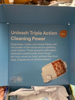 [This review was collected as part of a promotion.] I use the dishwasher when preparing large dishes or when hosting a party. I used this triple-action dish soap pack and loved it. It comes in 16 count. It cuts through everything. It contains powdered bioenzymes, breaks down stuck-on food residue, and is free from dyes, fragrances, and chlorine. The prices is ok. .