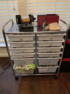 - TRANSPARENT FROSTED FINISH – Private yet transparent, these frosted white polypropylene drawers protect drawer contents with a light blur but also creates a nice simple modern look that fits any environment. The frame of the storage cart is constructed from steel and coated with a chrome plated finish. The 12 drawers are made of premium polypropylene plastic. Built to last you years.