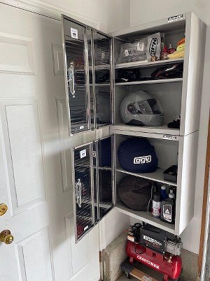 Adding more to our garage. These two wall units the most recent. Though not meant to be placed like this, they are perfect for the garage corner. Added Gorilla shelf liners