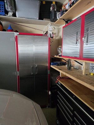 Makes any garage look organized. Sturdy, made of great material and perfect size. Love all the many levels for shelves to choose from. The clean lines would make this cabinet fit anywhere. One person could build the cabinet, but 2 makes it much easier. The more cabinets you build, the easier it gets. We have 4.