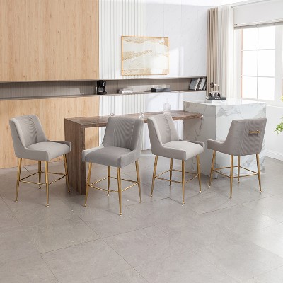 This stylish 39-inch tall bar or counter stool brings a touch of luxury and modern flair to any space. It features sleek gold metal legs that provide both stability and a chic, contemporary look. The stool is upholstered in soft velvet fabric, offering a plush and comfortable seating experience. Its standout design includes a convenient back handle, adding both a practical element for easy moving and an additional sophisticated touch. Whether used at a kitchen island, bar, or high-top table, this stool perfectly combines style and function, making it an elegant addition to your home decor.