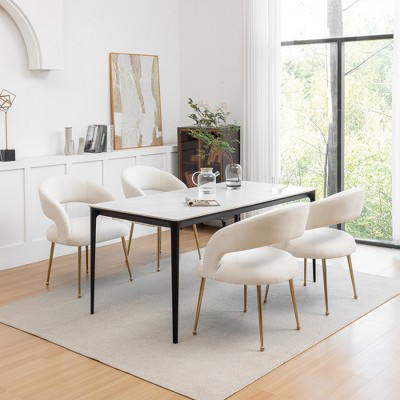 Enhance your dining experience with the luxurious appeal of our exquisite velvet dining chairs. Designed to elevate your space, the luxurious texture of these dining chairs ensures unparalleled comfort. Featuring a supportive backrest, these dining chairs are meticulously crafted to provide a longer dining experience. Sturdy metal legs ensure stability, while gold-colored back ring pulls add a touch of sophistication reminiscent of the Golden Age of Hollywood. Exuding timeless elegance, these chair six-piece sets effortlessly elevate any dining room, kitchen or area in need of sophistication.