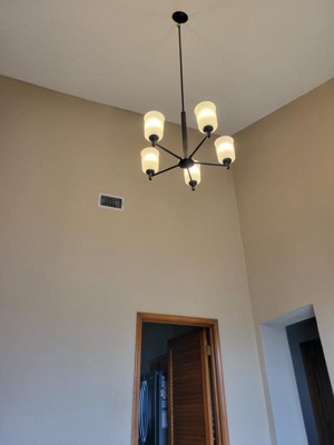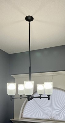 [This review was collected as part of a promotion.] I got the Shailene 5-Light Black chandelier for my dining room and I am so glad I did. The chandelier design is simple yet that is what makes it look so nice. It has a contemporary elegance feel to it that will go great with any home interior design. It is a 5 light chandelier that comes with satin etched glass shades that produce a warm yet bright light. The fixture does not include the bulbs but does work well with incandescent or LED bulbs. I do have a very high and sloped ceiling in that room so I was very happy that this chandelier was perfect for it. The Chandelier has a chain connected to the base which makes installing it in a sloped ceiling possible. It does also come with four extenders that help you customize its length, so how low or high you want it to hang. Beautiful chandelier that will surely bring your space together. Highly recommend this one.