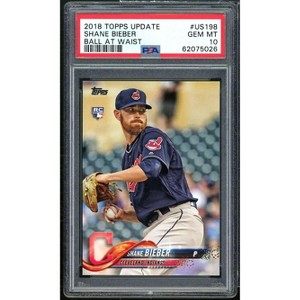 This is the 2018 Topps Update #US198 rookie card of star pitcher Shane Bieber, graded a pristine PSA 10. A must-have for collectors, this card highlights Bieber's breakout season and entry into the majors.