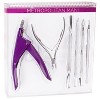 6PC manicure tool set for all your nail grooming needs. Includes: fuchsia spring loaded nail edge cutter, silver cuticle clipper, double sided (two sizes) cuticle pusher, silver double edged pusher and cleaner, silver double edged scraper and trimmer/pusher, double edged cleaner and scraper.These precision tools are great for preparing your nails for nail polish and manicure pedicure application, DIY Nail art , Nail tools , Nail grooming and nail care .