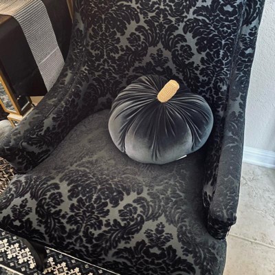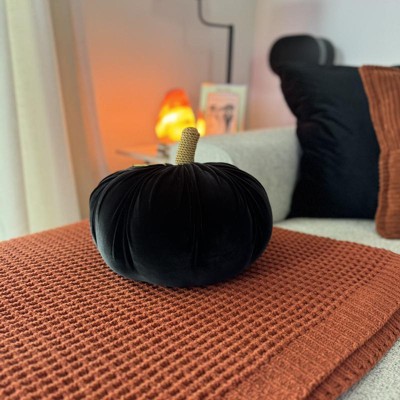 Add a cozy look and feel to your seasonal decor with this Shaped Velvet Pumpkin Throw Pillow from Threshold™. The novelty pillow is designed in a fun pumpkin shape in a black hue with a brown stem. Featuring a velvet exterior with soft polyester filling, the pillow adds the right amount of comfort and plenty of seasonal style to your sofa, chair or bench.