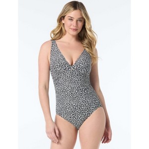 This Shapemaker one piece swimsuit will smooth your shape and provide comfortable all-around control with 360 degrees of tummy control. Front shirring flatters your stomach. V-neck with underwire shows just the right amount of skin while still offering support. Splashed with a dainty cheetah print.