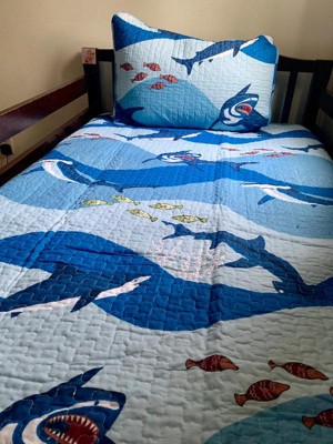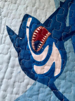 [This review was collected as part of a promotion.] I like that this Shark Allover Quilt set is great for any age. It works great on both my boys set even they get scared of seeing the sharks, then turnover the quilt to the other side. Both sides are great for any room. The material is not scratchy and very light. Most quilts are bulky and heavy ,but the material on the Sharks All over set is lightweight soft. Love the pillowy texture.