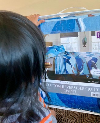 [This review was collected as part of a promotion.] I wanted this quilt set for my son, but my two year old daughter had other plans. She has claimed it for herself, she loves it so much! She thinks its the sharks from the baby shark song. She uses it everywhere she can, whether its cold or hot its perfect. Its tough, its survived many washes, without being damaged in anyway. It isnt to thick or to thin its the perfect amount of both. I personally like that it is double sided with two different designs. Its true to size! I cant tell you how many times ive ordered bed sets and it doesnt fit right. We are super happy with this set!