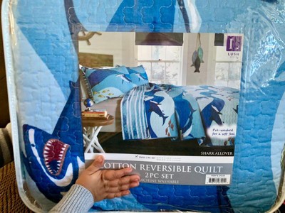 Decorate your child's bedroom with the fun Lush Decor Shark Allover Reversible Quilt Set. Dive to the ocean floor with this coastal bedding set, featuring a pattern of fish and different types of sharks, swimming through colorful waves. Enjoy 2 looks in 1 set! Easily switch up your kids bedroom decor by flipping this reversible quilt over to reveal a coordinating watercolor blue striped pattern. Available in twin and full/queen sizes. This toddler bedding set includes 1 reversible cotton quilt and 1 or 2 pillow shams. Crafted from 100% cotton fabric, this shark quilt set offers softness and comfort. The lightweight cotton blend filling is perfect for any season, and even makes this a great layering piece. STANDARD 100 by OEKO-TEX® certified, all components have been tested and certified free from harmful substances. To care for this kids bedding set, simply machine wash cold on the gentle cycle and tumble dry low. Use an iron on low heat to release wrinkles, if needed.