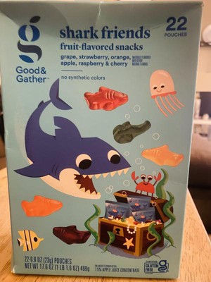 [This review was collected as part of a promotion.] These are the good & gather shark friends fruit-flavored snacks. The price is really good for a package of 22 servings. The flavors are grape, strawberry, orange, apple, raspberry, cherry, and each one is easily identifiable. The flavors are delicious! The texture of these fruit snacks is great. They are super chewy and I prefer that over a more tough fruit snack. I received an incentive to write this review.
