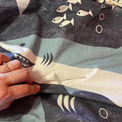 [This review was collected as part of a promotion.] My grandson loves his new Dream Factory Sharks Cotton Comforter Set, twin size. The design is super cool (his words) and the colors are nice and bright. The fitted sheet fits his twin mattress and stays in place. The sheets, pillowcases and comforter are all soft and wash well. They don't get fuzzballs on them after washing and they don't fade. The comforter set seems well made and that it will hold up over time.