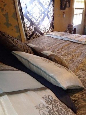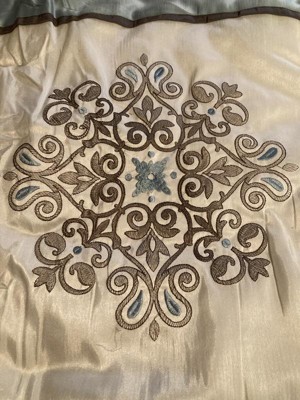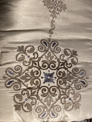 - 3 embroidered medallions on top of bed