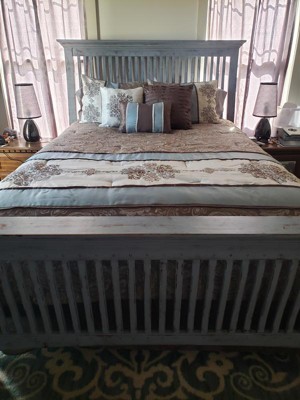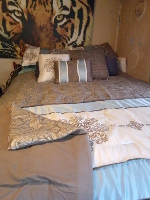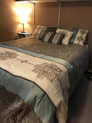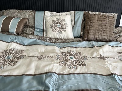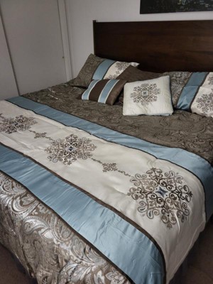 [This review was collected as part of a promotion.] I thought this Madison Park - Caroline Jacquard 7 Piece Comforter Set would be perfect for our bed in the way of coordinating with the soft brown walls of our bedroom. I was right. It complements the paint color perfectly and makes such a stylish statement in our room. The fabric feels satiny and is somewhat shiny and shimmery. The blue and light brown colors of the different fabric patterns perfectly complement each other and are beautiful together. The embroidery embellishments are gorgeous and feel luxe. The jacquard patterned fabric that mixes the brown and blue together is lovely. All in all, this is a wonderful way to upgrade your bed for winter or really, any time of year. Can't wait to show it off to my gal pals when they come over. It's really a very pretty bed set.