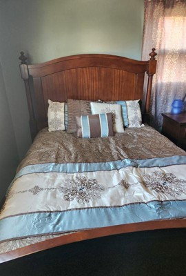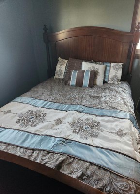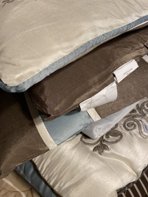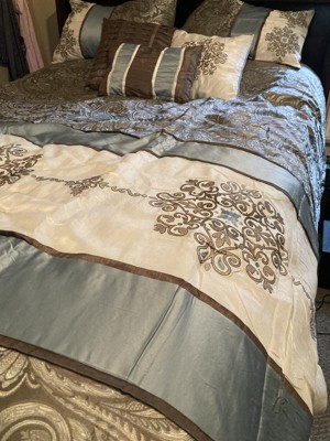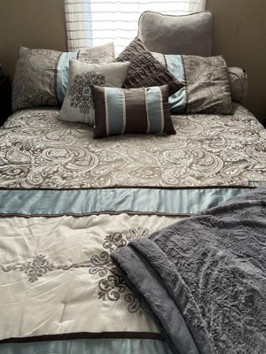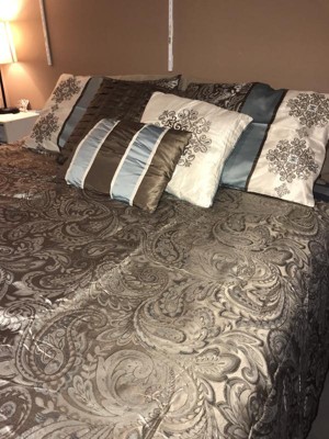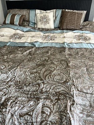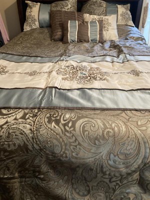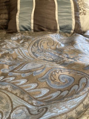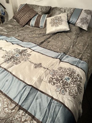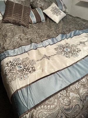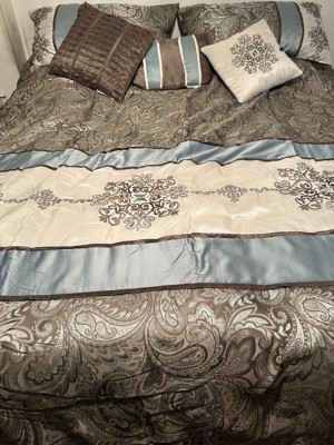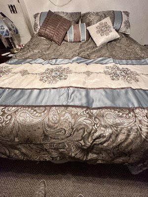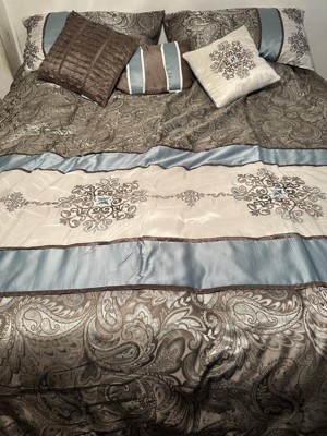 For style and comfort, update your bedroom with the Sharon Polyester Jacquard 7pc Comforter Set. The polyester jacquard woven comforter is featured with an elegant paisley pattern in a soft color palette of blue, brown, and ivory. The intricate design is separated by brown piping and two blue strips with four beautifully embroidered medallions stitched onto the ivory center. A solid brown reverse provides a pleasant neutral touch, while coordinating shams mirror the stylish motif seen on the top of the bed. Three decorative pillows use fabric manipulation and embroidered details to add texture and charm. Machine washable for easy care, spot clean on decorative pillows, this jacquard comforter set brings an extravagant and traditional touch to your bedroom. An included brown bed skirt give the comforter set a truly finished look.