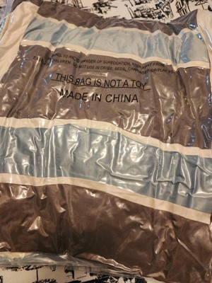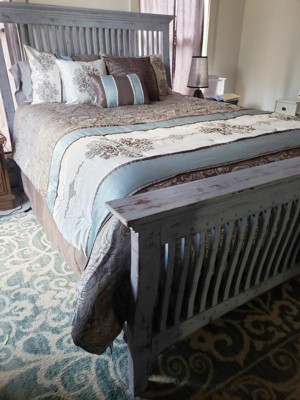 A: It is definitely brown, beige and teal. We have twin xl beds put together and the king size doesn't fit. The sight really needs to give the dimensions.