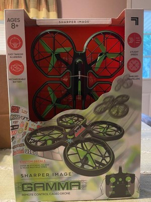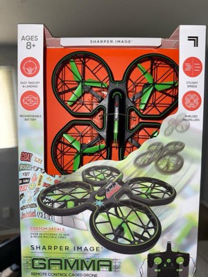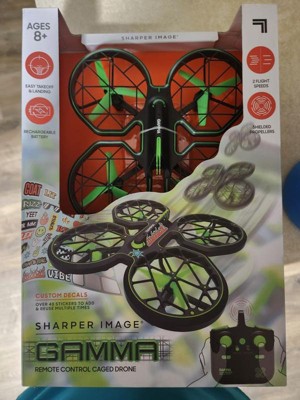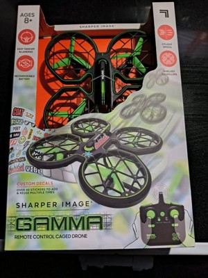 Take flight indoors with the Sharper Image® Gamma Drone. This lightweight 6.9-inch RC drone is beginner-friendly with assisted takeoff and landing plus intuitive Auto-Orientation control. The caged propeller design protects your drone from bumps and helps keep flights safe and steady. You can personalize your drone with over 40 reusable decals to give it a custom look every time. With two speed modes and a 2.4GHz wireless remote that works from up to 150 feet (45.7 m) away, this drone offers both control and range. Recharge the built-in battery using the included Micro USB cable and get back in the air fast. Ideal for kids and first-time flyers.