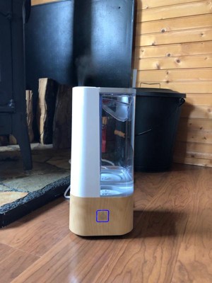 [This review was collected as part of a promotion.] Really love this humidifier. Pros- cool mist, nice and quiet, Also recommend using distilled water. My allergies/ congestion went away within my first night of using.This humidifier works great to provide moisture to our bedroom. Holds a fair amount of water and allows me to run it all night on high for 2 nights before refilling , very nice wood design gives a nice decor to the house/ bedroom. The only downside is the LED light in the button. The light is very bright and does not turn off. As someone who likes the room to the complete dark this is a downside.
