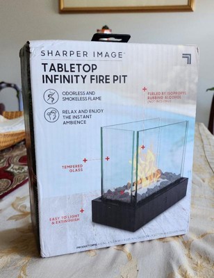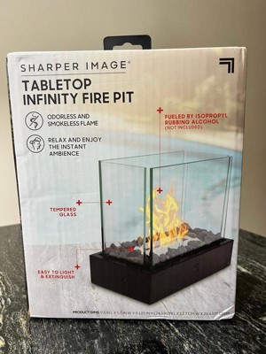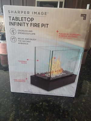 [This review was collected as part of a promotion.] The Sharper Image Tabletop Infinity Fire Pit is a perfect choice for any one looking for a chic table centerpiece. The sleek design is made of the finest materials. The Tabletop Infinity Fire Pit is made of durable steel and tempered glass. It was very easy to assemble. The glass panes are are clear for you to easily see the flame with any obstruction. There is no need for batteries for your Sharper Image Tabletop Infinity Fire Pit. You only need 70%-91%Isopropyl rubbing alcohol or Bioethanol. The alcohol allows for 30 minutes of burning time. That will create a beautiful flame without any smoke that would bother you. The compact design allows you to place your Tabletop Infinity Fire Pit on almost any size table. It also comes with it's own fire pit wooden looking pieces. So you will never have to find fire wood for your Sharper Image Tabletop Infinity Fire Pit. When your done enjoying your Tabletop fire pit all you have to do is use the snuffing cover to quickly extinguish the flames. There are no tools required to put your new fire pit together. All the pieces just fit perfectly together. I received my fire pit as a gift from Influencers. I'm so happy that I did. I hope you enjoy your Sharper Image Tabletop Infinity Fire Pit as much as my family and I have.