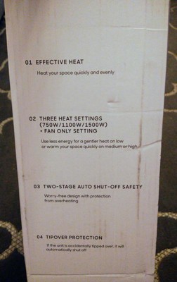 [This review was collected as part of a promotion.] This is a great heater! Slim, black design fits nicely in the corner of my husbands office and looks attractive not bulky. Very effective heater. It has three heat settings and heats up the space quickly. And if it is accidentally tipped over it automatically shuts off.