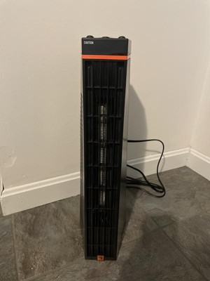 [This review was collected as part of a promotion.] Sharper Image Rise 20H Tower Heater. Have it to heat the bathroom during winter's chill time, works great for this purpose. The tower is slim and an easy fit. there are three options for the fan, the options change the amount of heat that is put out, not the speed of the fan. The machine is noisy (fan?). Shuts off at the slightest imbalance, which is a plus for a house with pets and kids.
