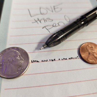 Sharpie, as usual, has not let me down! Throughout the workday, I am CONSTANTLY jotting down something. The needle point on this pen allows me to write as tiny yet clearly as I can without smearing! (Smaller than the letters on a US quarter - see picture!) The metal clip on it as opposed to the usual plastic most other brands use is also really nice and holds up much better without fear if it snapping.