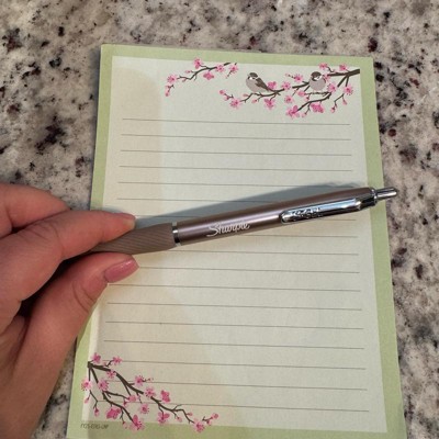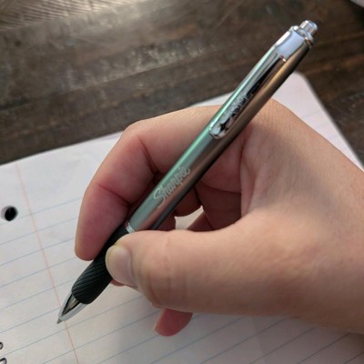 [This review was collected as part of a promotion.] Another great version of the sharpie pen. The pewter-colored metal barrel looks and feels so sleek. The pen writes very smoothly and does not smudge. The ink started flowing right away. The weight of the pen makes it feel even more luxurious. The click to retract feature works well and I love that I don’t have to worry about losing a pen cap. This pen seems like it should cost so much more than it actually does. I received an incentive to write this review.