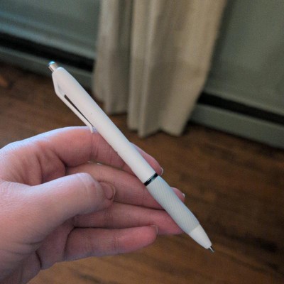 [This review was collected as part of a promotion.] This pen is very useful. My favorite thing is the cushioning that makes it really easy to write. I get very sweaty hands and this keeps it from slipping out of my hand during a test. The barrel is a bright white color and the ink is bright black because it is a gel pen. There is a no smear no leak technology in this new pen by sharpie. It’s a must have for college students. I received an incentive to write this review.