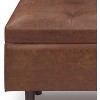 Hand constructed using solid wood, engineered woods and high density foamUpholstered with a durable Distressed Saddle Brown Vegan Faux LeatherFeatures a lift up lid that opens to a large interior storage space and child safety hingeMulti-functional ottoman can be used in bedroom, living room, family room, hallway as an entryway bench, foot stool, accent furniture or provide additional sittingMid Century design includes a tufted detailingAssembly RequiredDimensions: 17.7in D x 47.6in W x 18.5in HEfforts are made to reproduce accurate colors, variations in color may occur due to computer monitor and photography