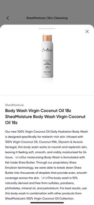 [This review was collected as part of a promotion.] Scent Rich, tropical coconut fragrance that feels fresh but not overly sweet. It gives a spa-like vibe in the shower and lingers lightly afterward. Texture Creamy and smooth, lathers nicely without being too foamy. It feels nourishing rather than harsh. Effectiveness Cleanses well while leaving skin soft and hydrated. Works especially well for dry skin, thanks to the coconut oil. No tight or stripped feeling after rinsing. Packaging The bottle is sturdy and easy to use, though the cap can get a little slippery in the shower. The design has the natural, earthy SheaMoisture look. Value For an 18 oz bottle, it’s a generous amount and lasts a long time since a little goes a long way. Feels like a good investment compared to other body washes in the same category.