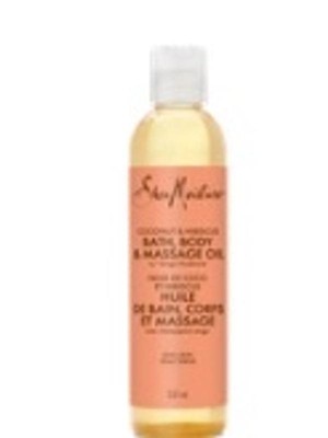- SheaMoisture's Coconut & Hibiscus Bath, Massage & Body Oil is infused with naturally derived ingredients like Coconut Oil & Hibiscus to help prevent dry skin.