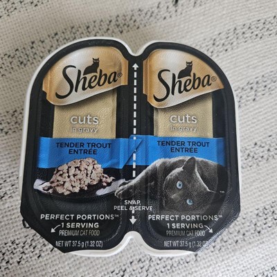 Both my cats love these Sheba cuts in gravy. The tender trout entree has good chunks of seafood, enough gravy, and the right amount. Good nutrition. The package has an easy of portions but seal so good that makes it hard to open.