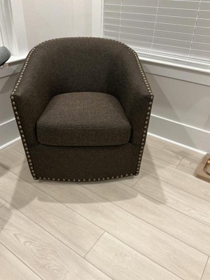 Relax in style with the Sheldon Swivel Chair. The curved design and high-density foam cushion creates a deep and comfortable seat allowing for instant relaxation. Bronze nail heads line the arms and back adding charm and style to the lounge chair. The swivel feature allows the lounge chair to rotate on its black metal base. Upholstered in a chocolate-colored fabric, this swivel chair fits in any room of your home.