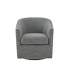 Relax in the comfort and elevate your living room with the Sheldon Swivel Chair. Upholstered in a rich fabric, this swivel chair features silver nail heads that line the arms and back for an elegant touch. The curved design creates a luxurious silhouette, while the high-density foam cushion provides a deep and comfortable seat. The swivel feature allows the lounge chair to rotate 360 degrees on its black metal base.