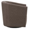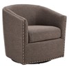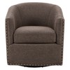 Relax in style with the Sheldon Swivel Chair. The curved design and high-density foam cushion creates a deep and comfortable seat allowing for instant relaxation. Bronze nail heads line the arms and back adding charm and style to the lounge chair. The swivel feature allows the lounge chair to rotate on its black metal base. Upholstered in a chocolate-colored fabric, this swivel chair fits in any room of your home.