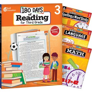 Shell Education 180 Days Reading, Spelling, Language, & Math Grade 3: 4-Book Set | This best-selling series provides 180 days of daily practice with lessons designed to immerse students in each subject, learn key skills, and form good habits. Teachers can easily incorporate these quick, diagnostic-based activities into their daily instruction. With each practice, students will evaluate their understanding of a concept and celebrate their improvement success. This set includes 4 grade-specific 180 Days books: Reading, Spelling, Language, and Math.